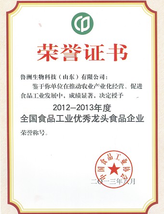近日,中國(guó)食品工業(yè)協(xié)會(huì)召開表彰2012——2013年度全國(guó)食品工業(yè)強(qiáng)縣(市、區(qū))和優(yōu)秀龍頭食品企業(yè)大會(huì),魯洲生物科技(山東)有限公司,被授予“全國(guó)食品工業(yè)優(yōu)秀龍頭食品企業(yè)”榮譽(yù)稱號(hào)。